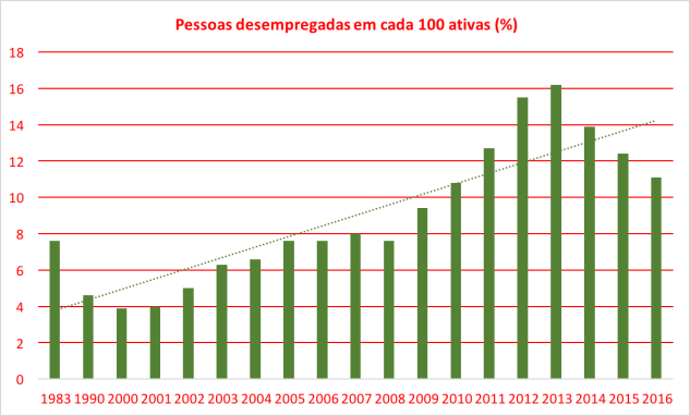 As estatísticas mostram que em cada 100 pessoas ativas existe, quase sempre, um número elevado de desempregadas. Então vejamos o gráfico que abaixo publico.
